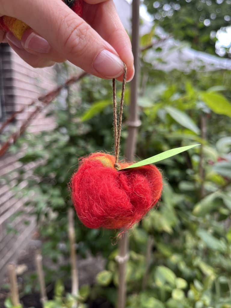Steek met een naald een bruine draad door het balletje, knoop aan de onderkant een knoopje als kroontje van de appel.