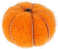 Wind om het pompoentje af te maken een draad strak rond het gevilte balletje, zoals op de afbeelding hiernaast. Zo krijgt het balletje de vorm van een pompoen. Je kan de draad steeds met een naald door het midden steken voor het mooiste effect, maar dit hoeft niet, je kan de draad er ook gewoon omheen knopen.